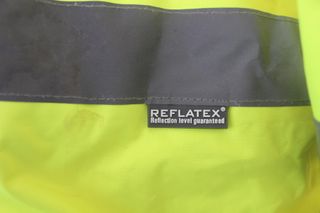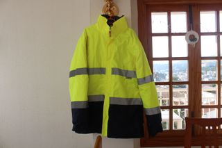 Chaqueta de trabajo de alta visibilidad en buen estado. - Color amarillo fluorescente con detalles en negro. - Bandas reflectantes grises en torso y mangas.