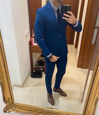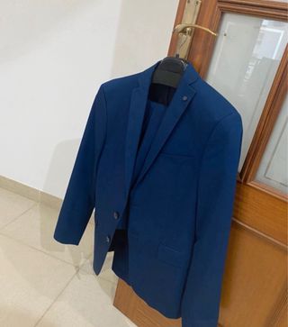 Traje de dos piezas de la marca Zara. - Chaqueta de corte moderno. - Pantalón ajustado. - Color azul marino.