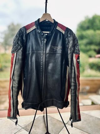 Vendo preciosa Chaqueta motera original Triumph con protecciones para los hombros y codos. Usada , pero cuidada . Todas las cremalleras y botones funcionan correctamente. Ya no tengo moto y lleva en el armario demasiado tiempo. Mira las fotos! Tall L / XL (44-54) Chaqueta de estilo motero con un diseño clásico y detalles distintivos. - Cuello mao con cierre de botón. - Paneles acolchados en hombros y codos. - Rayas de contraste en mangas y hombros. - Cremallera frontal. - Ajuste en cintura con botón.