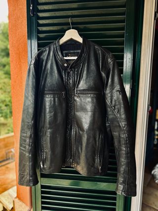Chaqueta vintage de cuero estilo motero, ideal para un look urbano y atemporal. Su diseño clásico la hace una prenda versátil. - Material: Cuero genuino. - Cierre frontal asimétrico con cremallera. - Bolsillos con cremallera en el pecho y laterales. - Cuello con solapas y botones a presión. - Puños con cremallera.