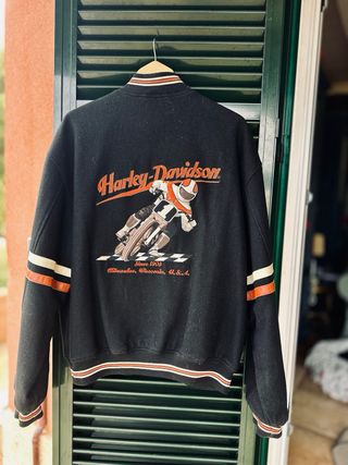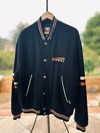 Chaqueta estilo bomber de Harley-Davidson, un clásico para los amantes de la marca. - Diseño en color negro con detalles en las mangas y cuello. - Cierre de botones a presión. - Bolsillos laterales con cremallera. - Puños y cintura elásticos con rayas.