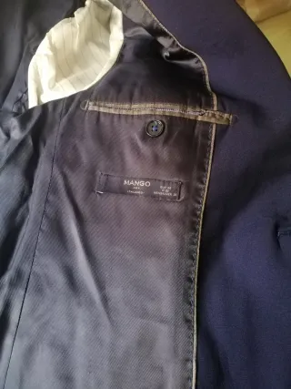 Traje de chaqueta y pantalón de la marca Mango. Color azul marino. Corte juvenil. Usado muy pocas veces. Ideal para estas fiestas. - Chaqueta de corte Slim Fit. Talla 48 - Pantalón a juego Slim Fit. Talla 40