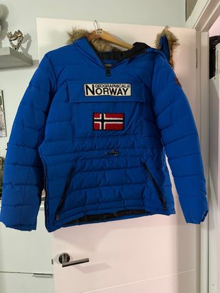 Chaqueta de invierno Geographical Norway para hombre. - Color azul vibrante. - Diseño con capucha y pelo. - Bolsillo frontal tipo canguro. - Parche de la bandera de Noruega.