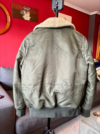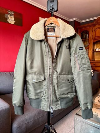 Chaqueta estilo bomber de la marca Schott en muy buen estado, color verde oliva. Presenta un cuello de oveja ,desmontable y un diseño clásico. - Cierre frontal con cremallera. - Dos bolsillos delanteros con solapa y botón. - Bolsillo adicional con cremallera en la manga. - Puños y cintura elásticos.