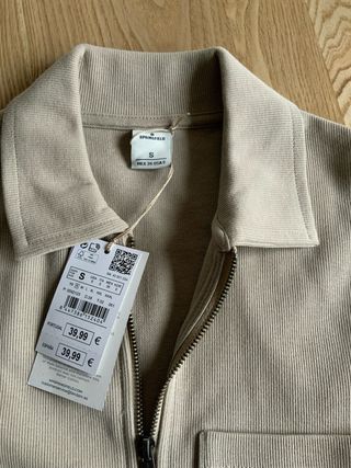 Chaqueta tipo sobrecamisa de Springfield en color beige. Cierre de cremallera frontal y un bolsillo en el pecho. - Cuello camisero. - Manga larga. - Puños y bajo elásticos.