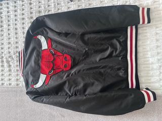 Chaqueta estilo bomber de la NBA con el icónico logo de los Chicago Bulls. Es la talla S pero es grandecita - Diseño clásico en color negro. - Detalles de rayas en puños y cintura. - Parche del logo de los Bulls en la espalda.