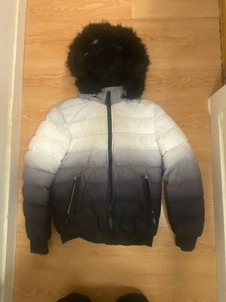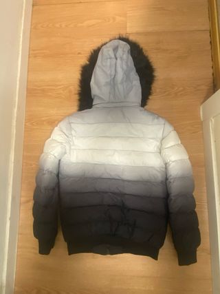 Chaqueta acolchada con el interior de lana y un diseño degradado de blanco a negro. La capucha está adornada con pelo sintético. - Cremallera frontal. - Bolsillos laterales con cremallera.