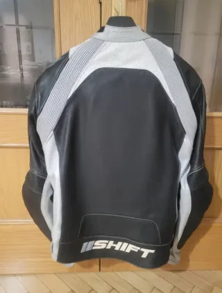 Chaqueta de cuero para moto con diseño deportivo. - Color negro y blanco. - Logo SHIFT en el pecho y mangas. - Cierre de cremallera frontal. - Cuello alto. -Forro interior desmontable. -Protecciones en codos y hombros. -Regalo también espaldera Dainesse. -Tiene poco uso. Talla L Perfecta para salidas deportivas y de paseo.