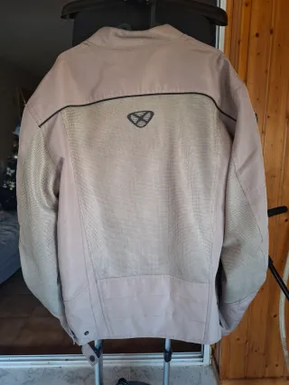Chaqueta de moto de verano, ideal para días calurosos. Su diseño permite una buena ventilación. - Color beige. - Cierre con cremallera y botones a presión. - Bolsillos frontales con cremallera. - Detalle de tejido de malla en la zona delantera y trasera. - Con protecciones de plástico en espalda y codos.