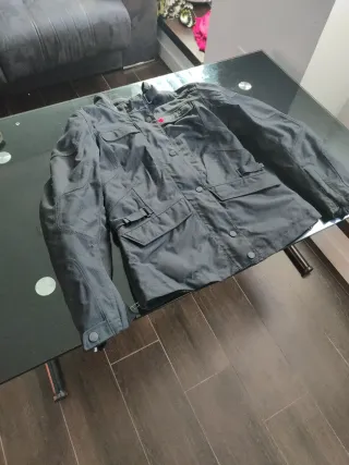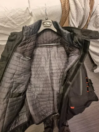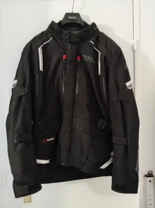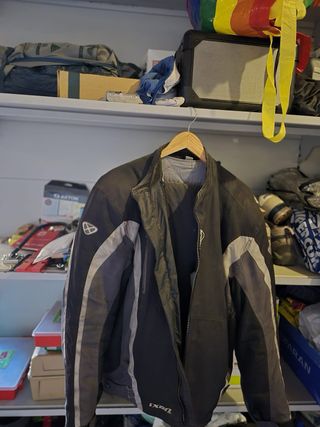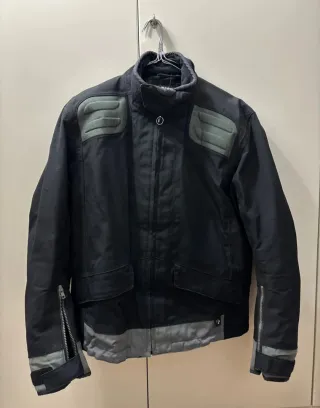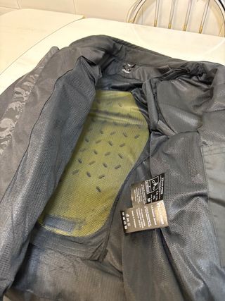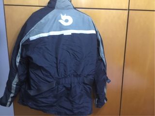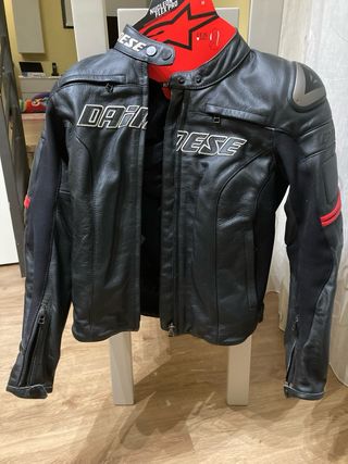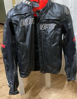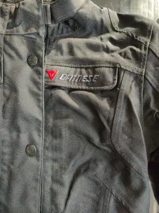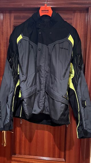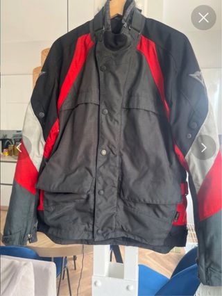 Chaqueta de moto Dainese en talla 50. Ajustable en cuello, brazos y puños y cintura. Con forro interior desmontable para invierno y verano. Cierre frontal con cremallera y botones, tiene hecho un refuerzo a la altura del abdomen para evitar desgarres tal y como se ve en las fotos. Múltiples bolsillos frontales e interiores.Modelo con thinsulate y 100% repelente del agua, con tecnología Dtec-D dry. Incluye protecciones de brazos y hombros. El único desperfecto que tiene es en el tirador de la cremallera que se solventa poniendo un tirador o un llavero de tira. Ninguna caída ni manchas de aceite.
