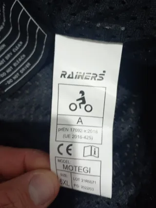 Chaqueta de moto RAINERS modelo MOTEGI. - Talla 6XL. - Certificación prEN 17092-x:2018 (UE 2016-425). - Homologación CE. - Lote: 21R0071. - Fecha de producción: 2022/03.