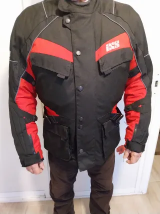 Chaqueta de motorista con diseño moderno y detalles llamativos. - Color principal negro con detalles en rojo. - Logo de la marca Ixs visible. - Múltiples bolsillos frontales. - Cremalleras en las mangas.