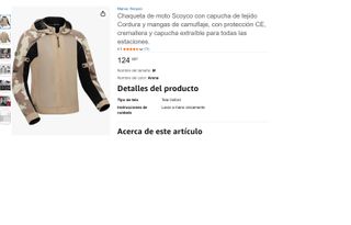 Chaqueta de moto Scoyco con capucha de tejido Cordura y mangas de camuflaje. Ideal para todas las estaciones. - Protección CE. - Cremallera y capucha extraíbles. - Tipo de tela: Oxford. - Instrucciones de cuidado: Lavar a mano únicamente.