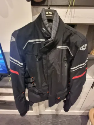Chaqueta de moto Clover modelo Laminator en color negro. Diseño moderno con detalles reflectantes y elementos de ajuste. Talla XL. Ideal para todo el año pk tiene un forro extraible, es impermeable, i tiene proteciones c2 en hombros y codos se puede añadir una proteccion extra en la espalda solo se ha usado 4 veces. Precio negociable - Marca: Clover - Modelo: Laminator - Color: Negro - Detalles: Rayas plateadas y detalles en rojo en mangas y cintura. - Cierre: Cremallera frontal con solapa. - Ajustes: Hebillas y velcros en cintura y mangas.