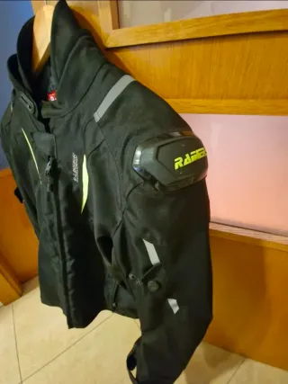 Chaqueta de moto RAINERS MISURI-F talla L Como nueva: Comprada hace menos de 1 año y usada un par de meses. Precio nueva 180€ - Color negro y amarilloreflectante. - Protecciones en hombros y codos. - Forro térmico desmontable con bolsillo. - Forro interior poliéster con bolsillo. - Membrana impermeable. - Cinturón ajustable.