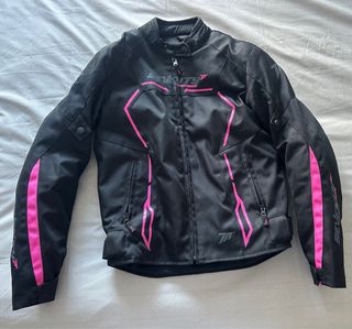 Chaqueta de moto R-Tech en color negro con detalles en rosa y elementos reflectantes. - Diseño deportivo. - Cierre de cremallera frontal. - Cuello alto. - Puños ajustables. - Cintura ajustable.