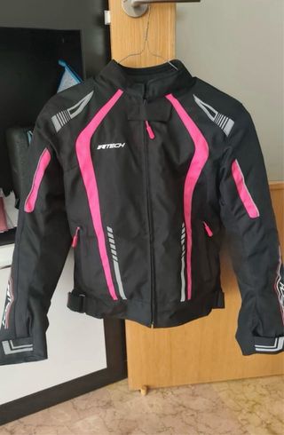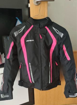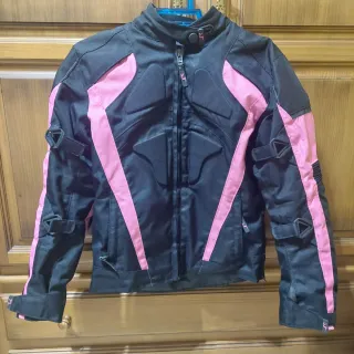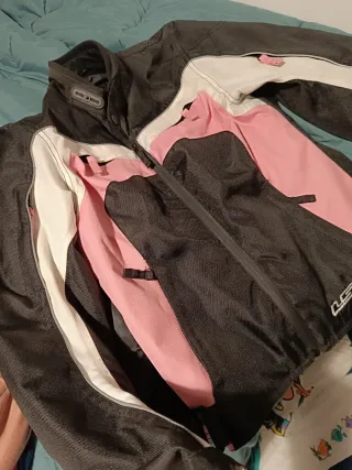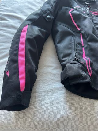 Chaqueta de moto para mujer, talla 36-38, con combinación de negro, blanco y rosa palo. Lleva protección en los codos y en la espalda. Incluye forro que se puede quitar o poner.