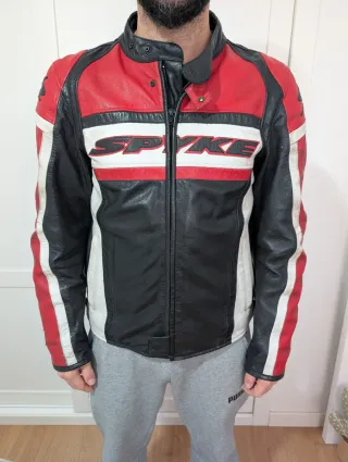 Chaqueta de cuero para motociclismo con diseño deportivo. - Talla 50 - Combinación de colores negro, rojo y blanco. - Marca SPIKE - Cremallera frontal - Protecciones codos y hombros - Bolsillos exteriores e interiores