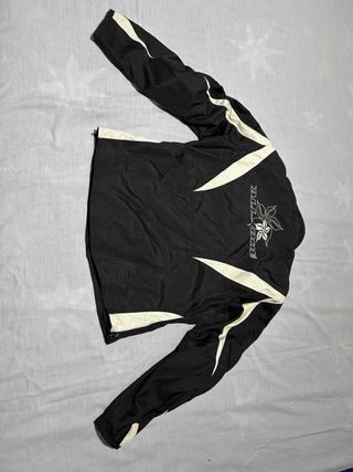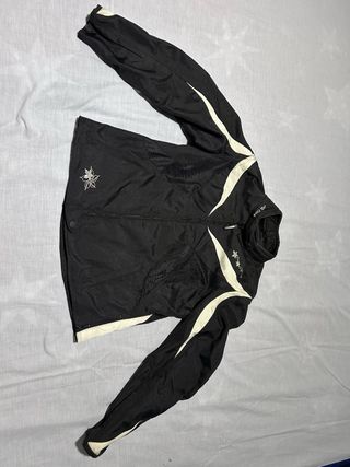 Chaqueta de moto negra con un diseño moderno y detalles en blanco. - Cremallera frontal. - Cuello alto. - Diseño con líneas blancas. - Bordado de estrella en el pecho. - Talla 42
