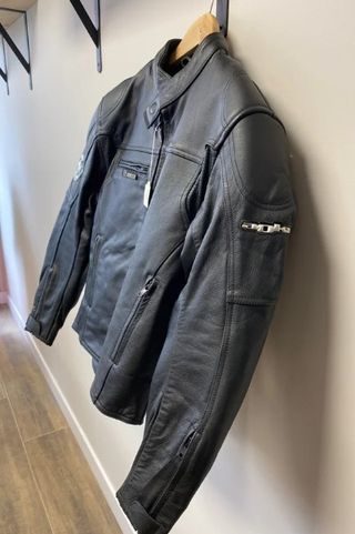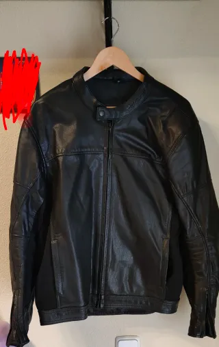 Chaqueta de cuero (100%)negra para motociclismo. Diseño clásico y resistente. - Cuello alto con cierre. - Cremallera frontal. - Bolsillos con cremallera. - Puños ajustables. Muy bien conservada