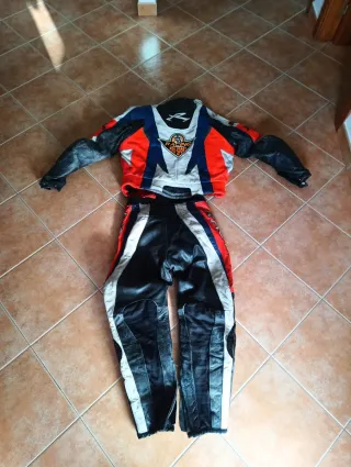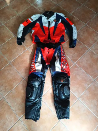 Mono de moto de dos piezas, ideal para la práctica deportiva. - Chaqueta de cuero con protecciones. Talla 58 - Pantalón de cuero con protecciones. Talla 54 - Diseño en rojo, blanco y azul. - Inscripciones 'Racing' y 'Pro-Sport'. Con bastante uso como se ve en las fotos. Perfecto para alguna rodada en circuito.