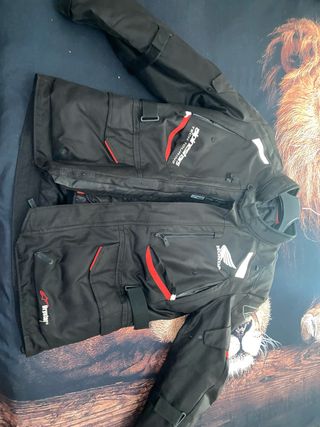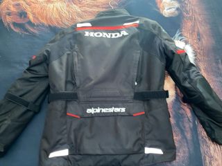 Chaqueta de moto Alpinestars con detalles Honda en color rojo y blanco. Diseñada para touring. PRECIO NEGOCIABLE - Color negro. - Logo Alpinestars en manga y pecho. - Logo Honda en pecho. - Bolsillos frontales. - Cierres de velcro y cremallera.