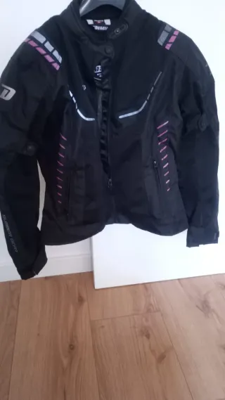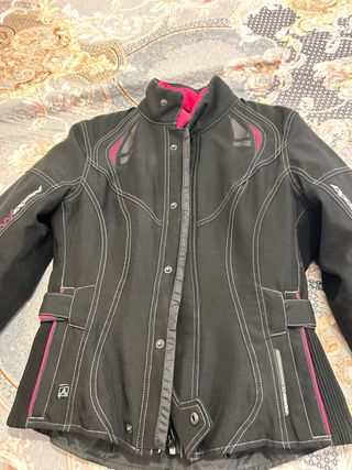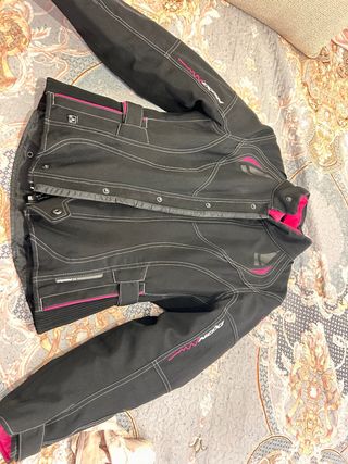 Chaqueta de Moto para mujer con detalles en rosa. - Cierre frontal con cremallera. - Mangas ajustables con cremalleras. - Detalles de uso. - Se tiene que cambiar la protección en el hombro derecho. ( foto 8 ) - No tiene emblema en la espalda ( Foto 4 ) Precio negociable.