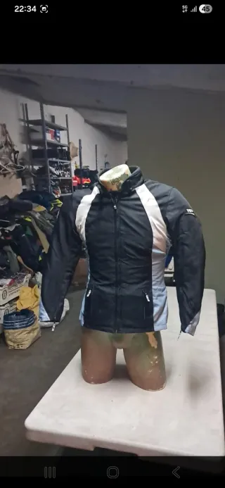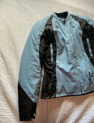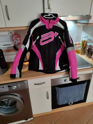 Chaqueta de moto para mujer en talla XXS-XS con un diseño moderno y deportivo. Cuenta con todas las protecciones, únicamente tiene el borde del cuello roto del desgaste tal como se aprecia en la foto, de ahí el precio.