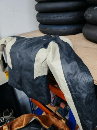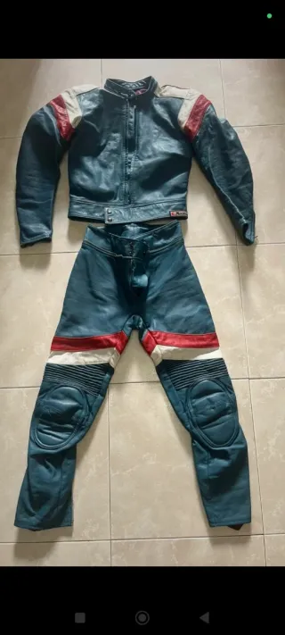 Conjunto de chaqueta y pantalón de cuero para motociclismo. - Chaqueta con detalles en azul con bandas blanco y rojo. - Pantalón con bandas de color azul blanco y rojo. - Diseño deportivo.