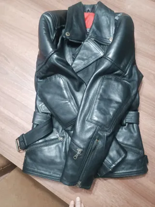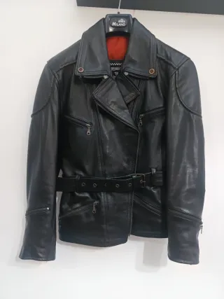 Chaqueta de piel auténtica 100% vacuno para mujer, marca Metallic’ko (Leather Jackets, Est. 1987), talla 42. Estilo biker clásico en color negro con forro interior rojo acolchado, muy llamativo y cómodo. Piel gruesa y resistente, con buen peso y acabados de calidad. Características: • Piel natural 100% vacuno • Forro interior rojo (poliéster) • Puños interiores elásticos para cortar el viento • Cinturón ajustable en cintura • Múltiples bolsillos con cremallera (exteriores e interiores) • Refuerzos en codos y detalles moteros • Cremalleras en mangas • Chaqueta robusta, ideal para moto o uso urbano Estado: NUEVO sin etiqueta