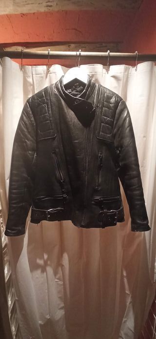 Chaqueta de cuero negra para mujer, estilo motero. Se encuentra en buen estado. - Diseño acolchado en hombros. - Cierre frontal con cremallera. - Múltiples bolsillos con cremallera. - Cinturón ajustable en la parte inferior. - Años 90. Se puede entregar en Vitoria, Miranda de Ebro.