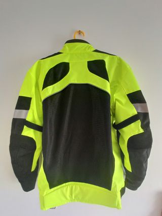 Chaqueta de verano para motociclista con un diseño llamativo y seguro. Recibido cambio - Paneles de malla para ventilación. - Detalles reflectantes para mayor visibilidad. - Protecciones en codos y hombros.