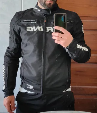 Tallaje grande. tricapa (forro térmico y membrana impermeable Humax, desmontables). Hombros y codos con refuerzos en cuero y protecciones YF nivel 1. Protector de espalda en espuma de alta densidad. Dos bolsillos verticales de ventilación en el frontal con otros dos amplios e impermeables en la parte inferior. Cremalleras de salida de aire posteriores y gran bolsillo lumbar para guadar la membrana o los guantes. Ajustes dobles en brazos y cintura, con elásticos y cremallera con doble apertura en brazos para ventilar. En el cuello, cierre con clip regulable. Solo pequeñas marcas en los reflectantes frontales por uso de chaleco airbag
