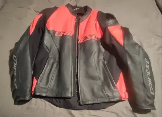 Chaqueta de moto Dainese Racing 4 en piel, con un diseño deportivo en negro y rojo fluor talla 54. Está prácticamente nueva