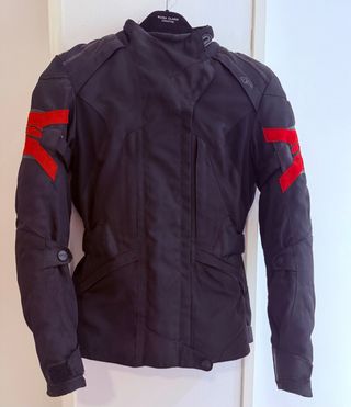 Chaqueta de motorista Spidi para mujer, con un diseño moderno y deportivo. - Color negro con detalles en rojo y blanco. - Cierre frontal con cremallera y botones. - Dos bolsillos delanteros con cremallera. - Cuello alto con cierre de botón. - Puños ajustables con botón. - Talla M