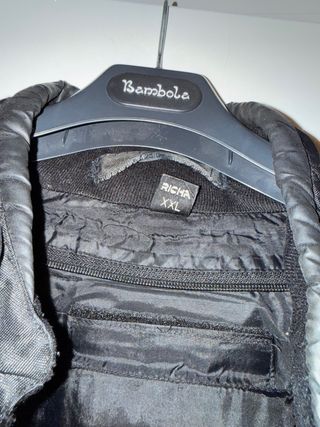 Chaqueta de moto Richa en talla XL. Diseñada para ofrecer comodidad y protección en tus rutas. - Color negro y rojo vibrante. - Cierre frontal con cremallera y solapa. - Cinturones ajustables en los laterales. - Bolsillos frontales con solapa. Protecciones en espalda, hombros y codos.