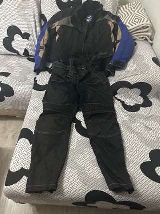 Conjunto de chaqueta y pantalón de moto en color negro, ideal para rutas. - Chaqueta con detalles en gris y azul. - Pantalón con cinturón y costuras visibles. Lleva protecciones y forros desmontables de pantalon y chaqueta cordura marca miline.