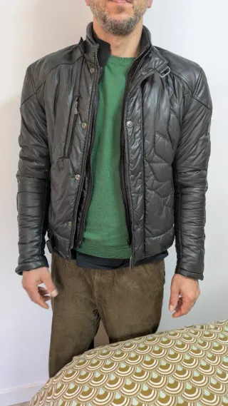 Chaqueta de cuero para moto de la marca Kiwi. Diseño clásico y resistente. - Talla L - Material: Piel. - Cierre de cremallera y botones a presión. - Cuello alto. - Bolsillos frontales con solapa y cremallera. - Puños ajustables.