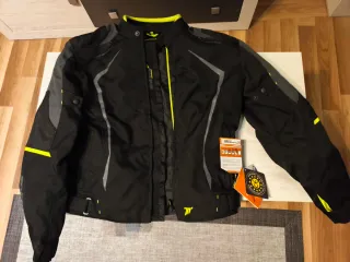 Chaqueta de moto de la marca Seventh, ideal para rutas. - Nueva, aún con etiquetas. - Color negro con detalles en amarillo y gris. - Cierre frontal con cremallera. - Puños ajustables. - Logos de la marca visibles.