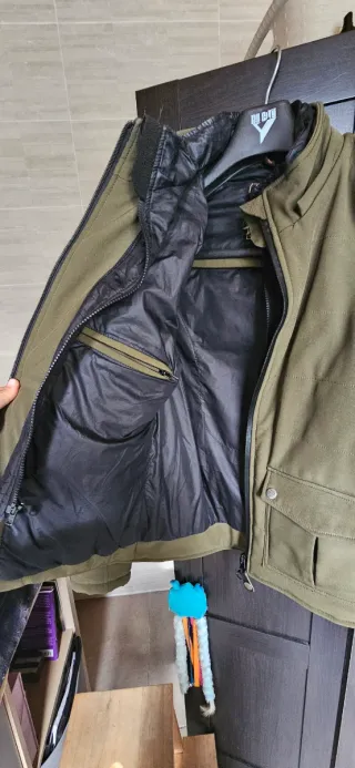 Chaqueta de moto con diseño de 3 capas, ideal para diferentes condiciones climáticas. Presenta un estilo deportivo y moderno. Con protecciones en codos, hombros y espalda. En buen estado