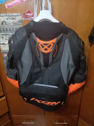 Chaqueta de moto Ixon con un diseño moderno y detalles en naranja. - Material principal: cuero y textil. - Protecciones integradas en hombros y codos. - Paneles perforados para ventilación. - Cierre frontal con cremallera. - Puños y cintura ajustables.
