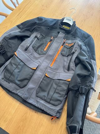 Chaqueta de moto Klim Carlsbad con tecnología Gore-Tex. Diseñada para ofrecer protección y comodidad en diversas condiciones climáticas. Nueva vale 775€ - Color gris y negro. - Múltiples bolsillos frontales. - Cremalleras naranjas. - Ajustes en puños y cintura.