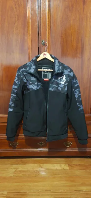 Chaqueta softshell con diseño deportivo y detalles en azul y gris. - Material de neopreno - Cierre de cremallera frontal. - Dos bolsillos laterales con cremallera. - Cuello alto. - Talla XS