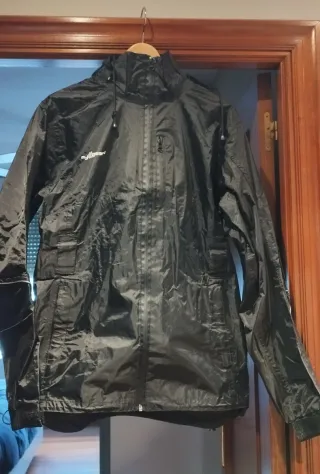 Chaqueta impermeable de color negro, ideal para usar en moto. Cuenta con capucha y cierre de cremallera. De sisa a sisa 50 cm. Largura total 70cm, por detrás es un poco más larga, 77 cm. Talla 42. Marca My Gear. - Bolsa con cremallera para su transporte. - Diseño ligero y funcional. - 3 bolsillos frontales con cremallera. - Cordones ajustables en la capucha. - Material reflectante en mangas. - Ajustable en caderas.