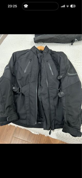 Equipación completa chaqueta + pantalón +protecciones interiores de cordura impermeable con dos puestas. Talla XL. Se la compró mi suegro y al poco no le renovaron el carné y tuvo que vender la moto. La equipación la ha tenido guardada hasta ahora. Esta perfecta salvo los detalles que están en las fotos.