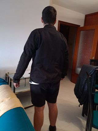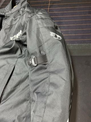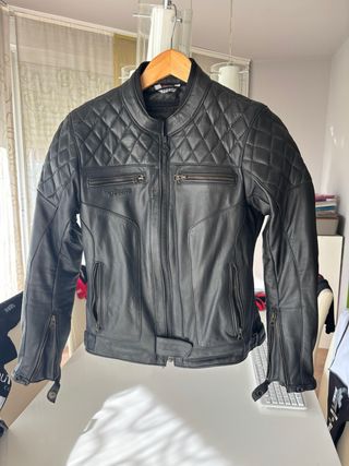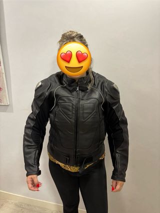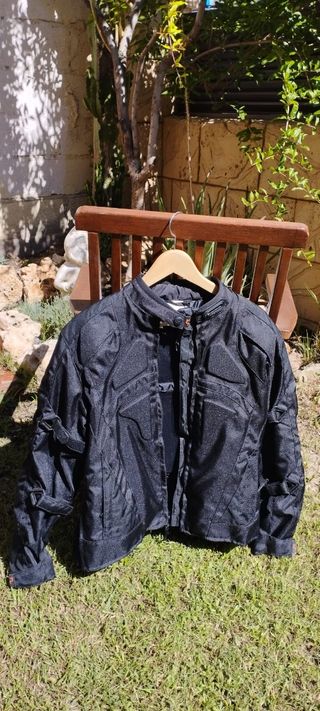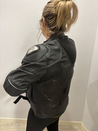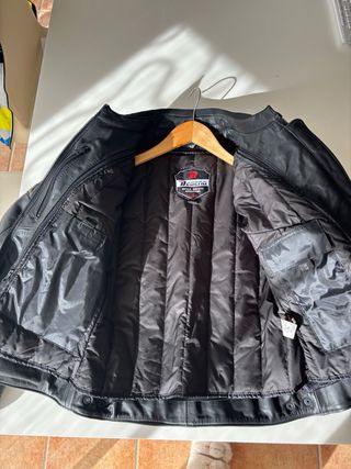 Talla XL, no da mucha talla. Piel bovina. Protecciones codos, posibilidad añadir en espalda y hombros. Ventilacion en zona de axilas. Hay forro termico- tipo chaleco. Una cremallera de la manga no se cierra. Facil de arreglarlo . Poco uso, en muy buen estado.