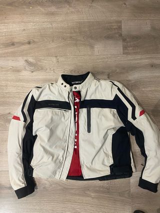 Chaqueta de moto Mtech para hombre, con un diseño moderno y funcional. - Color principal beige con detalles en negro y rojo. - Cierre frontal con cremallera. - Bolsillos frontales con cremallera. - Cuello alto con cierre de botón. - Mangas ajustables.