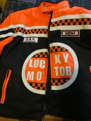 Chaqueta de moto para niño con diseño deportivo. - Color negro y naranja. - Detalle de cuadros y rayas. - Inscripción Lucky Motor y Racing en relieve. - Lleva acolchado en los codos.