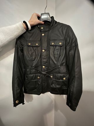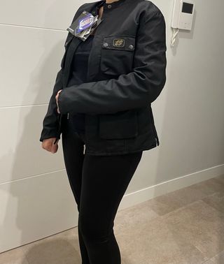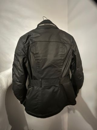 Chaqueta de moto para mujer de la marca Rev'it. - Talla: XS - Temporada: Invierno - Protecciones homologadas nivel 2 (de las amarillas) en espalda, codos y hombros. Compradas aparte en Iguana Custom. - Muy poco uso. - Diseño elegante y funcional. - Cierre frontal con cremallera y botones. - Cinturón ajustable a la cintura. - Bolsillos frontales con solapa y botón. - Cuello alto con cierre de botón.
