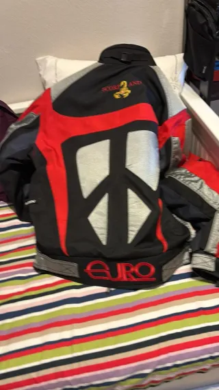 Chaqueta de moto con diseño llamativo en negro, rojo y gris. Presenta un gran símbolo de la paz en la espalda y el logo EURO en la parte inferior. - Diseño con detalles reflectantes. - Cierre de cuello ajustable. - Logos de la marca visibles.